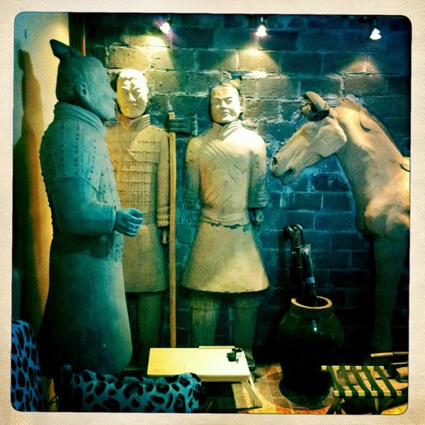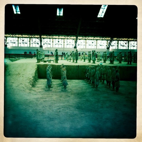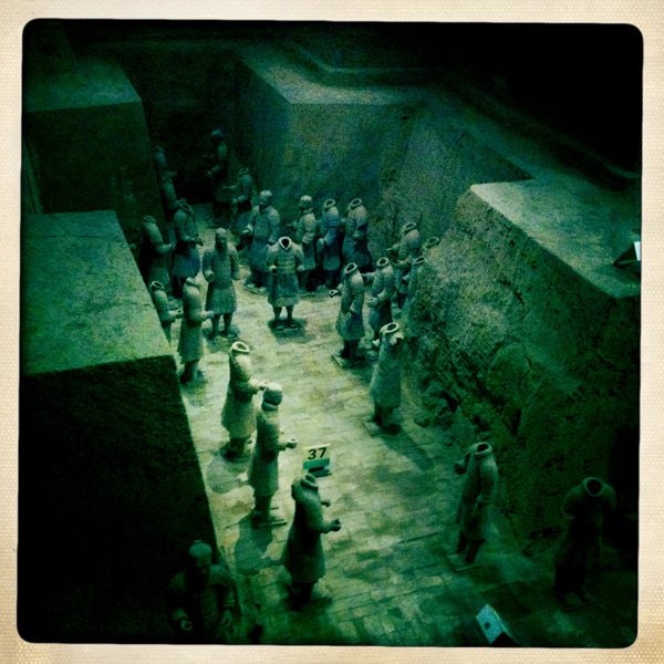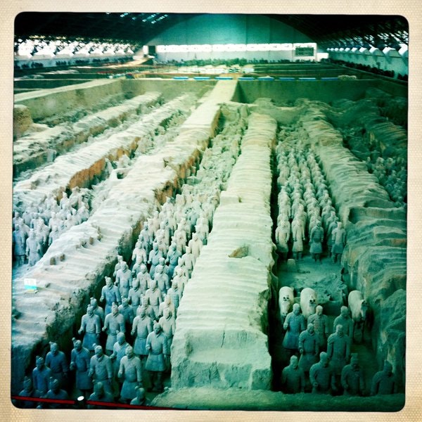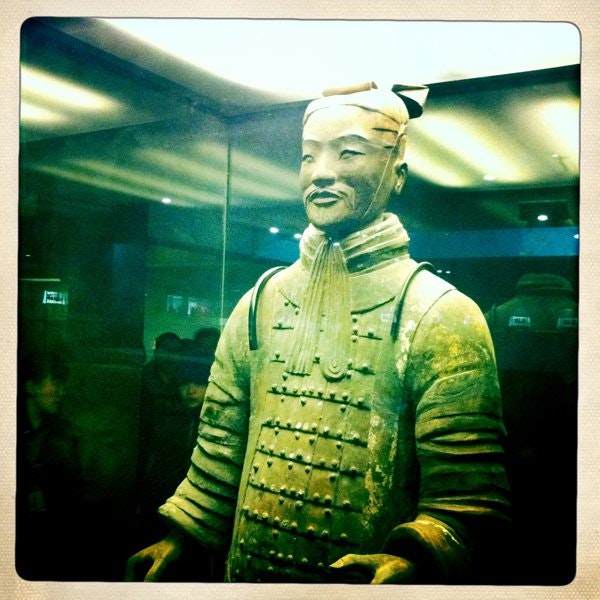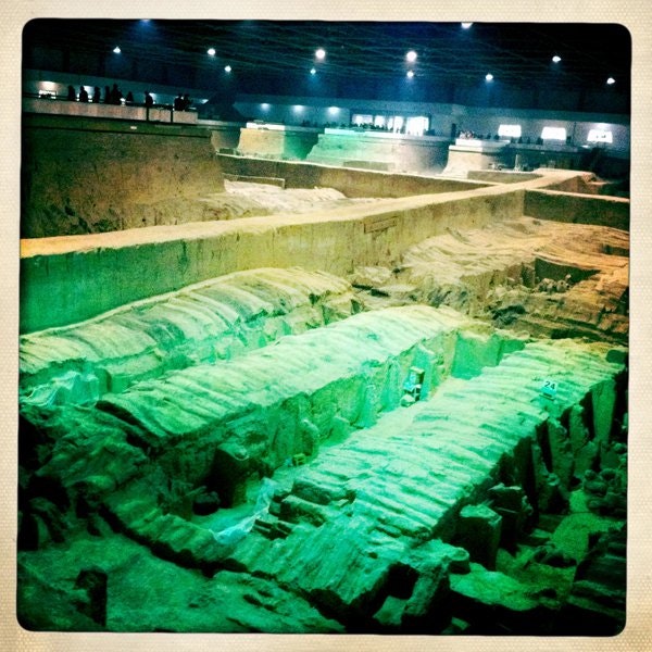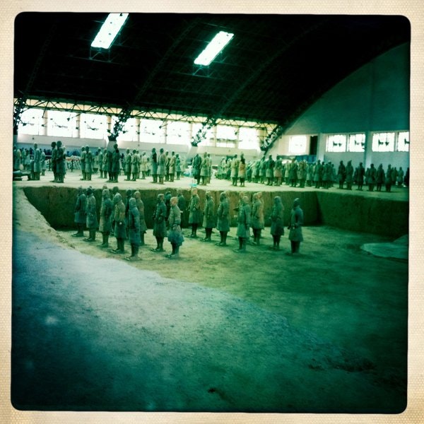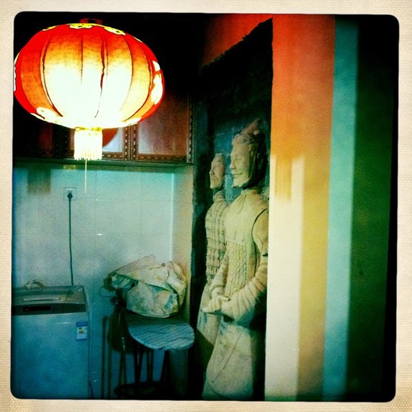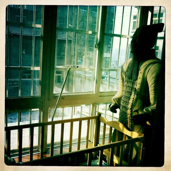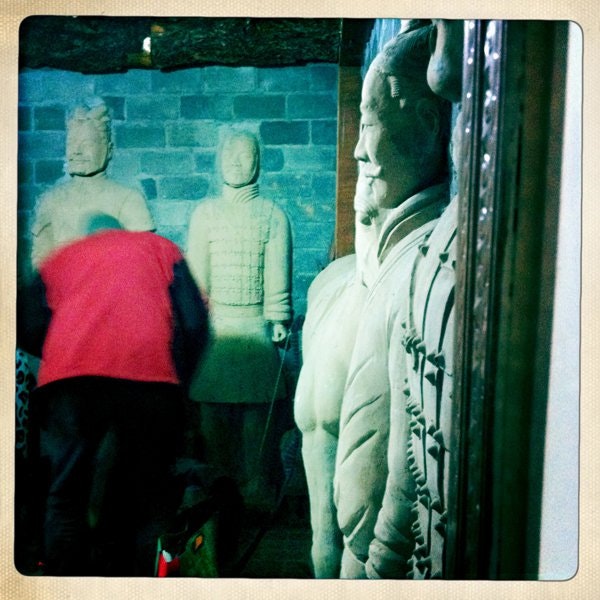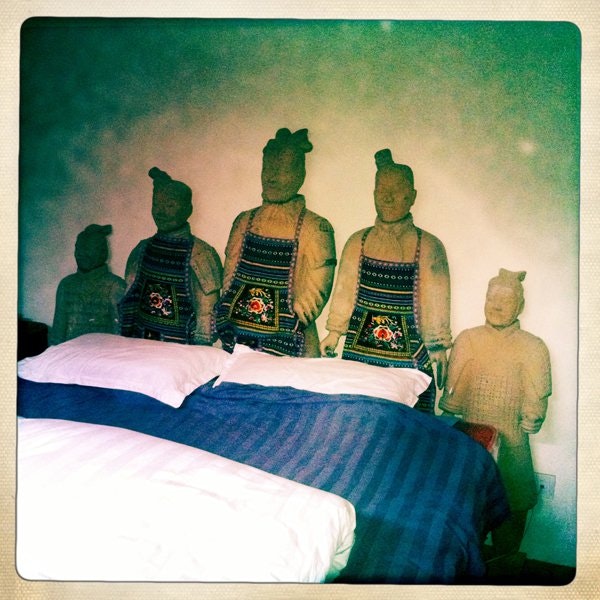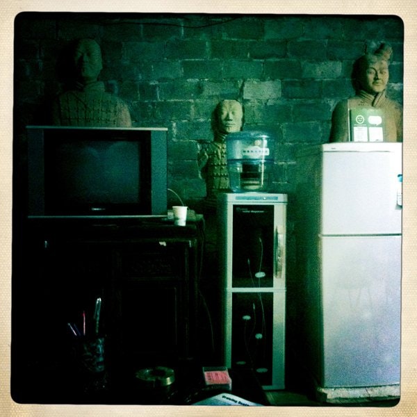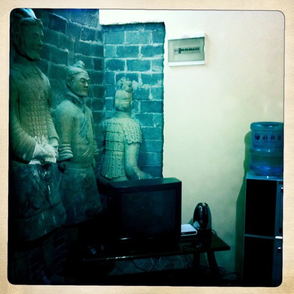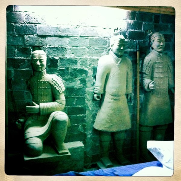 A short 17 hour train ride later and we were there. Cheryl, our resident producer quickly found us lodging with a man named Clarence who runs a suite of apartments aptly named "Warriors Apartments", as they are wall to wall Terracotta warriors ... everywhere, even under the beds. He also has his own theories of what happened with the Terracotta warriors, and his entire tour is in support of this, which was fine since we got to see stuff other people probably wouldn't have seen. Like a cave-dwelling village of old people. The actual warriors were pretty amazing considering how old they were and you can even purchase a life sized replica from the gift shop if you were so inclined.